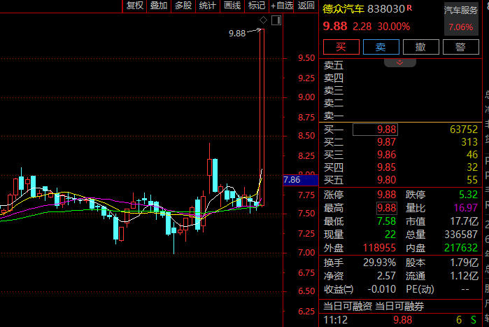 汽车服务概念股早间集体大涨,板块指数一度放量飙升逾9%富明配资,创1年半新高,开盘不到15分钟成交就超过昨日全天成交。板块内所有个股上涨,德众汽车直线30%涨停,上海物贸涨停,中汽股份、中国汽研、北巴传媒等多股触及涨停。